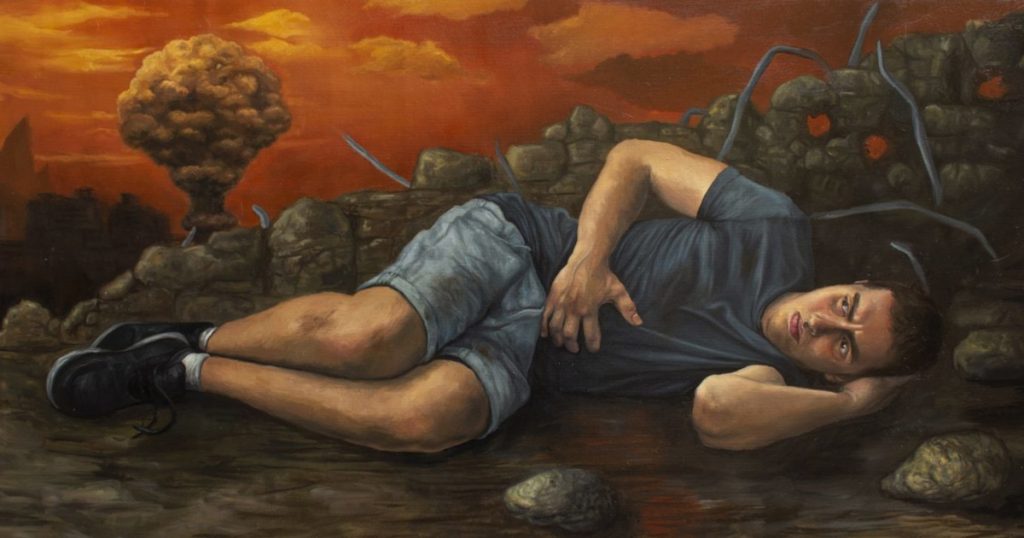 Vediamo qui rappresentato un autoritratto dell’artista Enrico Ibrahim Deiana, ad olio su tela, nel pieno del disastro; un paesaggio apocalittico, un fungo atomico alle spalle, in procinto di raggiungere il personaggio, muri che si trasformano in mostruose forme demoniache con occhi rossi; il ragazzo è pronto ad essere colpito dall’esplosione e si stringe lo stomaco, atto che diversi esorcisti richiamerebbero all’infestazione demoniaca.E’ il male qualcosa di materiale o spirituale?